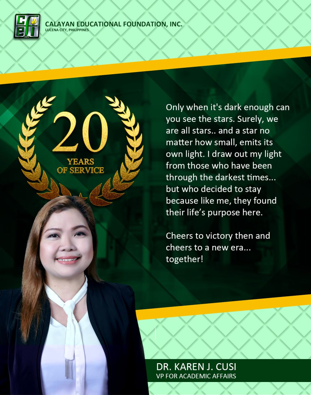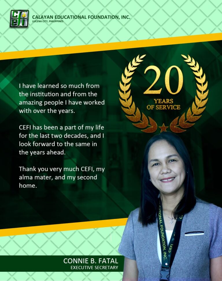 The CEFI community takes a moment’s pause to express its profound gratitude to two women who have selflessly devoted 20 years of their lives in service to our institution. Indeed, they are two of the silent yet sturdy cornerstones that make CEFI what it is today. Hats off to you, VPAA Dr. Karen Cusi, and Executive Secretary Connie Fatal!