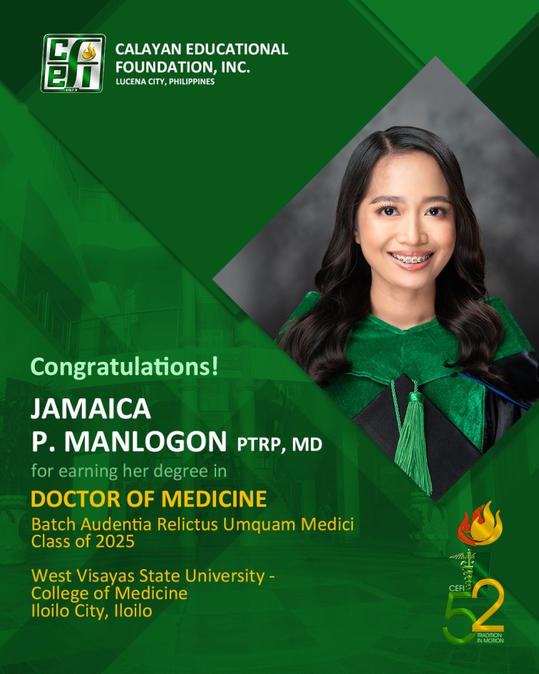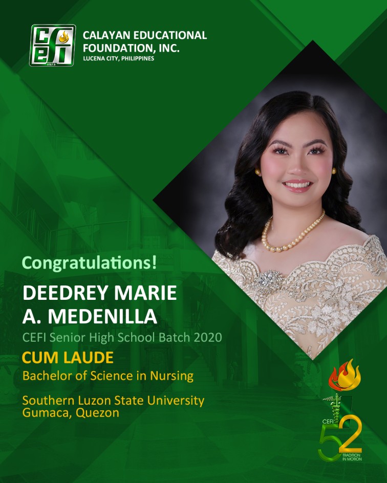 Congratulations! Ms. Deedrey Marie Medenilla (CEFI SHS Batch 2020)