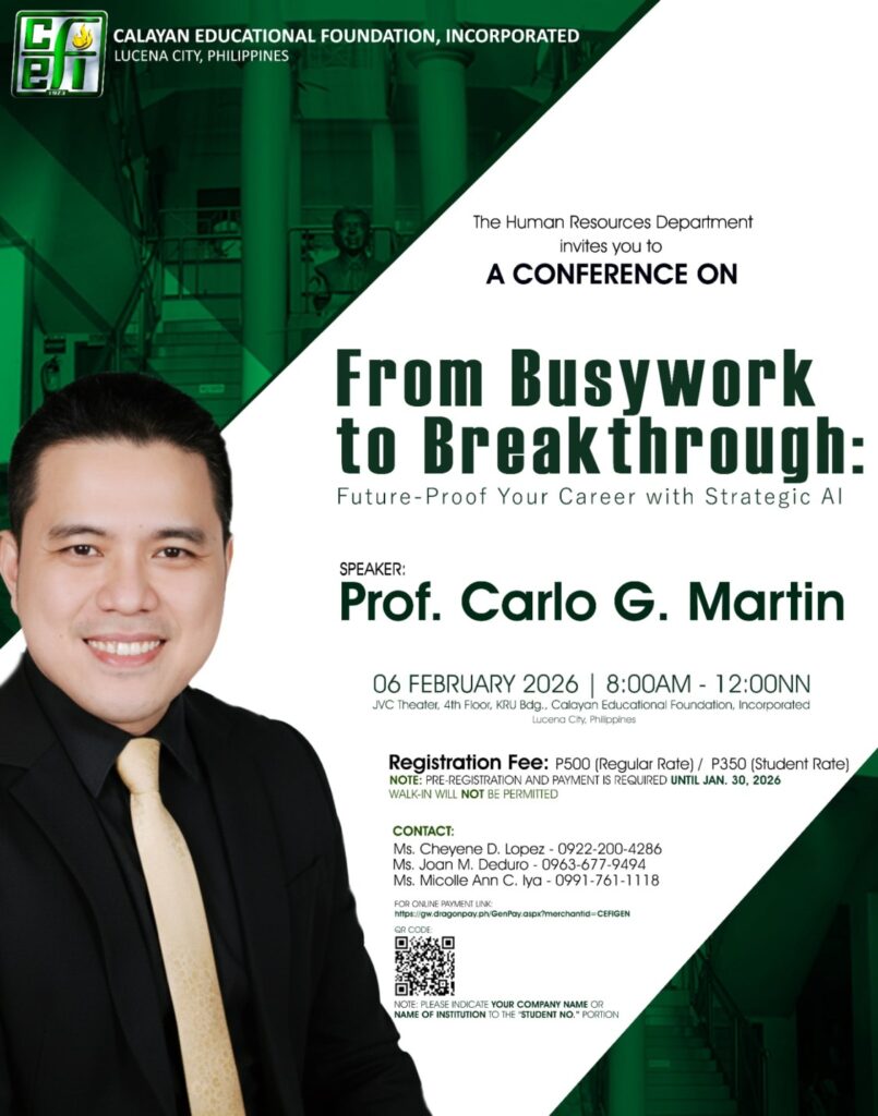From Busywork to Breakthrough: Future-Proof your Career with Strategic AI Transform the way you work and think.The CEFI Human Resources Department invites you to a conference on “From Busywork to Breakthrough: Future-Proof Your Career with Strategic AI,” featuring Prof. Carlo G. Martin. February 6, 2026 | 8:00 AM–12:00 NN JVC Theater, KRU Building, CEFI, Lucena CitySecure your […]
