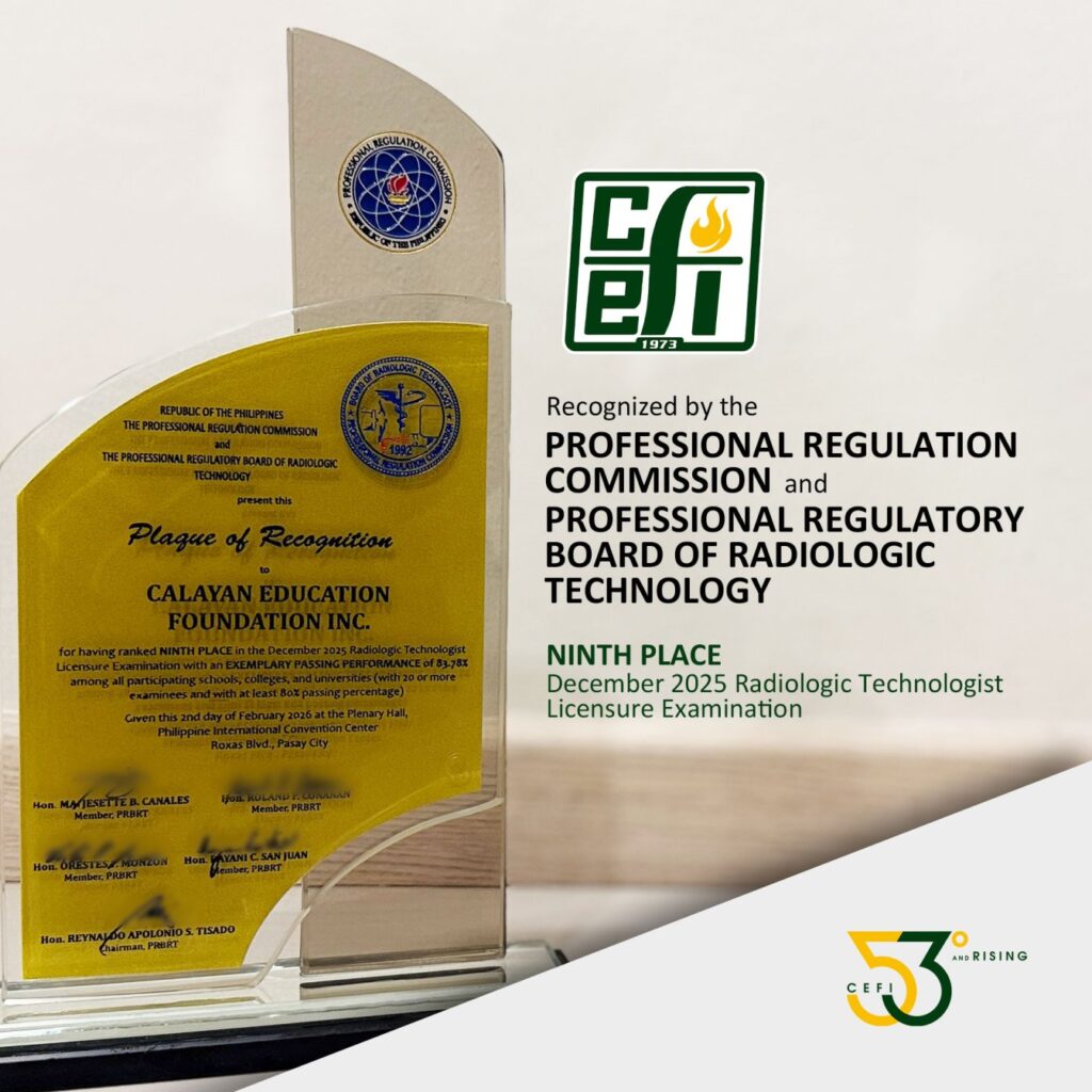 December 2025 Radiologic Technologist Licensure Examination Our heartfelt thanks to the Professional Regulation Commission and the Professional Regulatory Board of Radiologic Technology for recognizing CEFI for its 9th Place ranking in the December 2025 Radiologic Technologist Licensure Examination. At CEFI, we remain committed to produce competent and competitive Registered Radiologic Technologists and to uphold professional […]