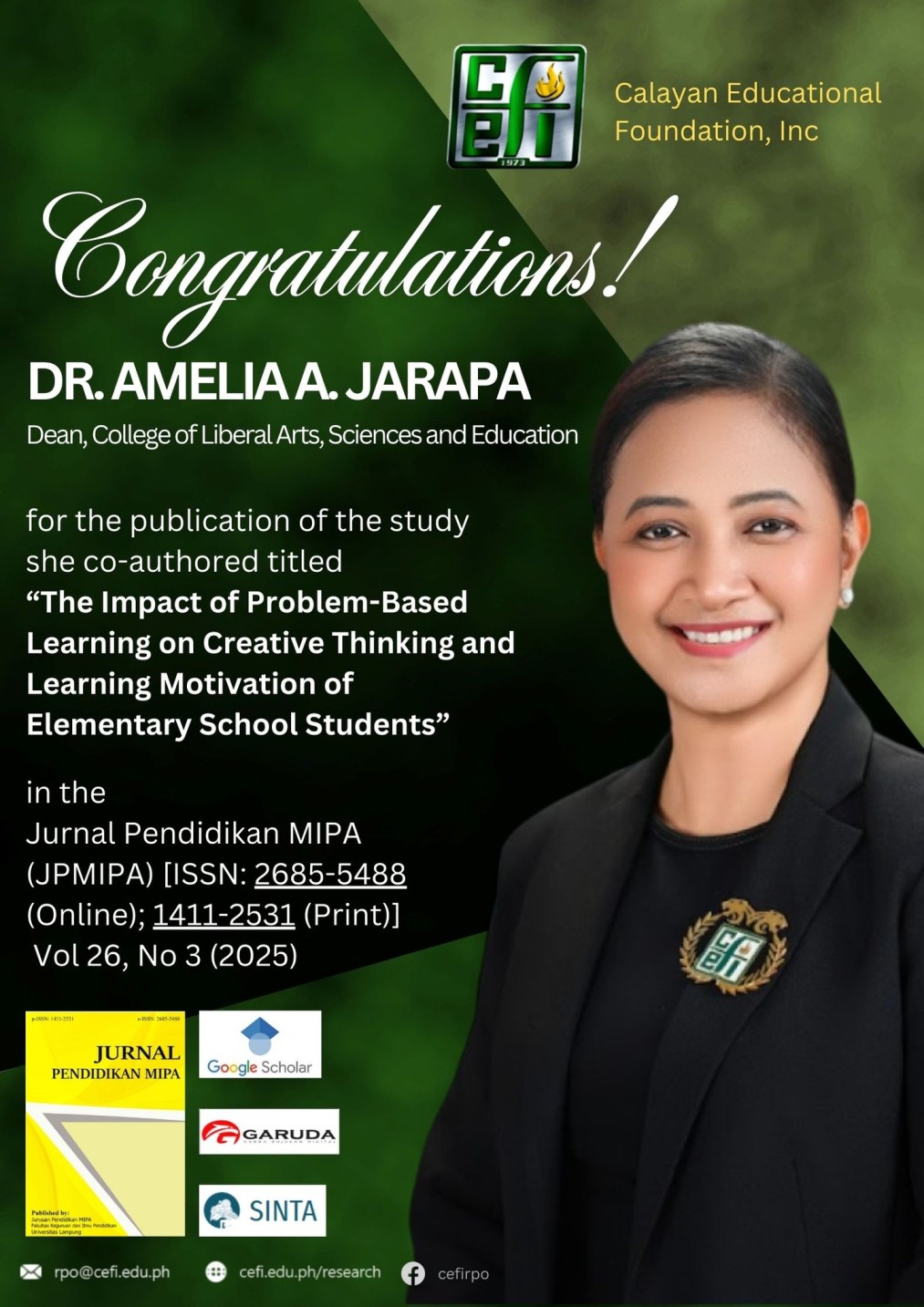 A round of applause for Dr. Amelia A. Jarapa! Her latest research has been officially published in Jurnal Pendidikan MIPA, showcasing her dedication to advancing education and science.