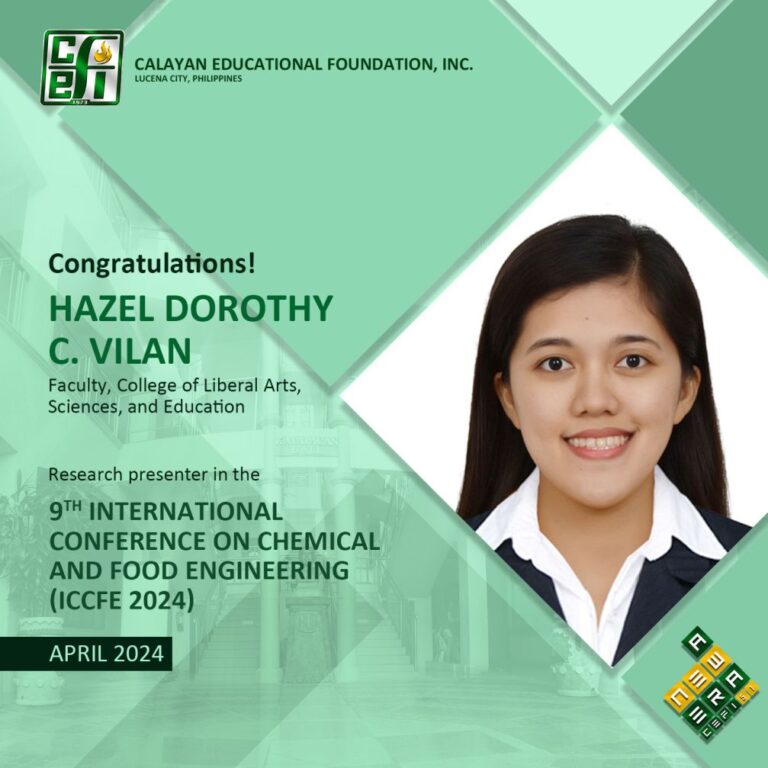 Congratulations to Hazel Dorothy C. Vilan, faculty of the College of Liberal Arts, Sciences, and Education, for her successful research presentation in the 9th International Conference on Chemical and Food Engineering (ICCFE 2024) held last April 9-12, 2024 at the Tokyo Institute of Technology, Japan. She presented her study entitled Investigation of the Chemistry and Reaction of Zinc Stearate on behalf of co-author Drexel Camacho.