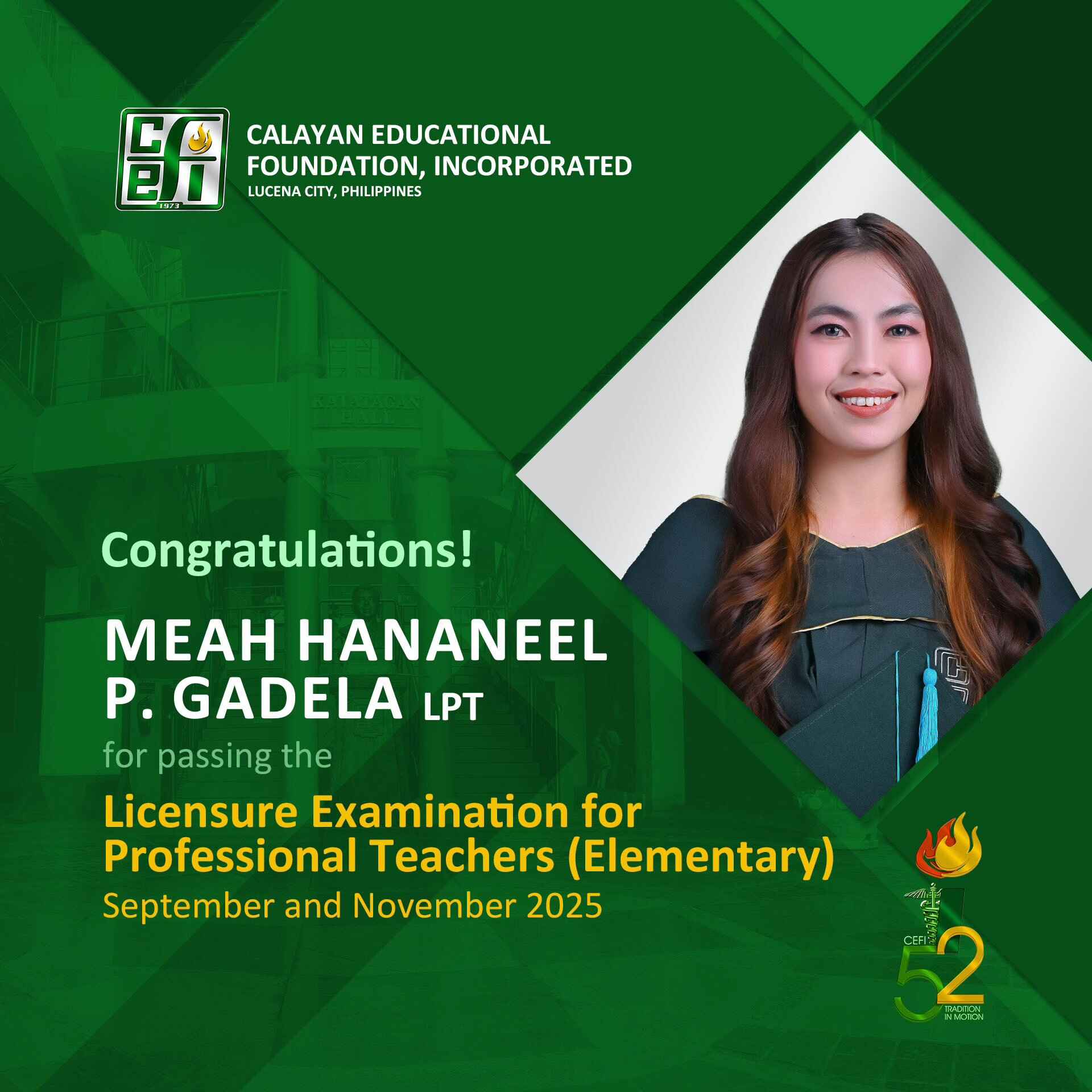 Congratulations to Ms. Meah Hananeel Gadela for passing the September and November 2025 Licensure Examination for Professional Teachers (Elementary)!