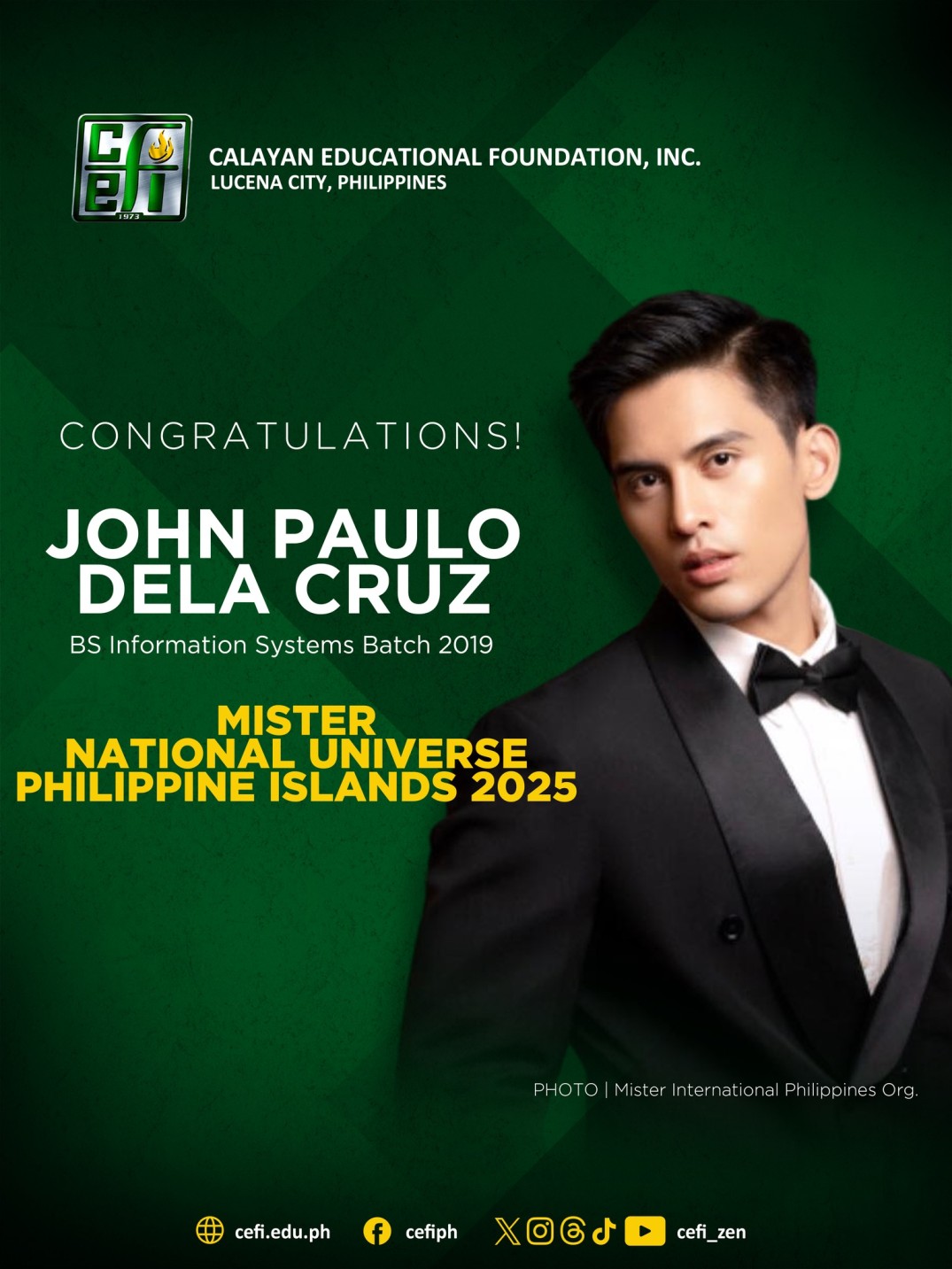Congratulations to Mr. John Paulo Dela Cruz (BS Information Systems, Batch 2019) for being crowned Mister National Universe Philippine Islands 2025 at the Mister International Philippines 2025 Grand Coronation, held on July 20 at Novotel Manila. Cheers!