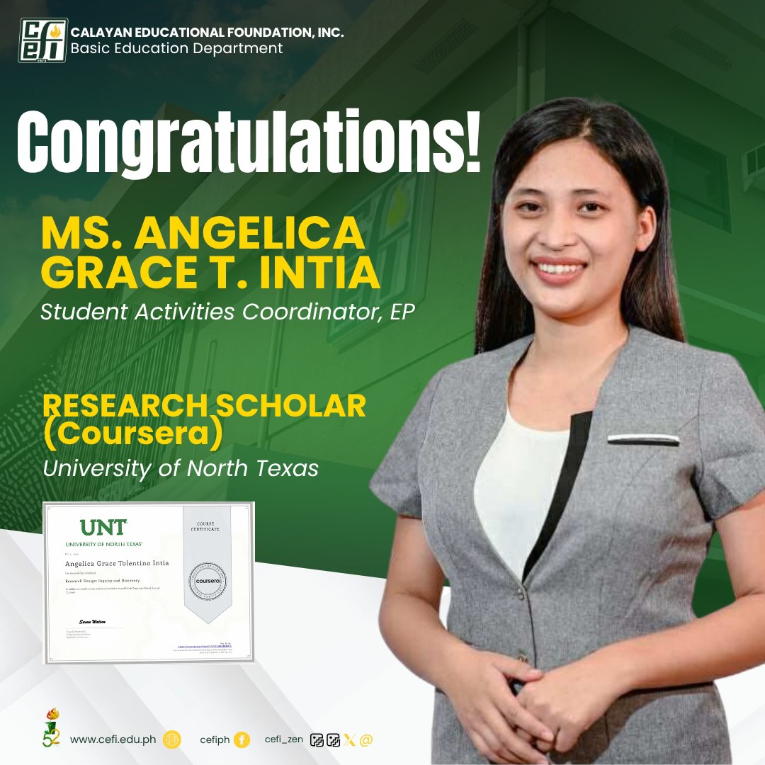 CEFI-BED proudly celebrates Ms. Angelica Grace T. Intia, our Student Activities Coordinator (EP), for earning her certificate as a Research Scholar (Coursera) under the University of North Texas. Your passion for growth and commitment to learning remind us that education truly knows no limits. Keep shining and inspiring, Ma’am Angelica.
