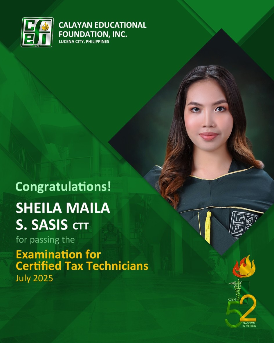 Congratulations to Ms. Sheila Maila Sasis (BS Accountancy Batch 2023) for passing the Examination for Certified Tax Technicians (CTT) under the Philippine Association of Certified Tax Technicians, Inc.! Cheers!