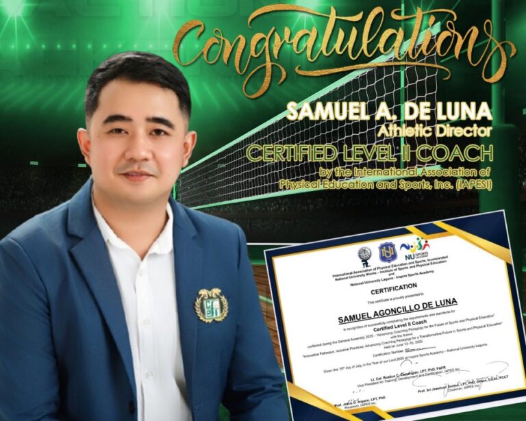 Congratulations to our Athletic Director, Mr. Samuel A. De Luna, for successfully passing the Level II Certification for Coaches by the International Association of Physical Education and Sports, Inc. (IAPES), a proud partner of the Philippine Sports Commission!