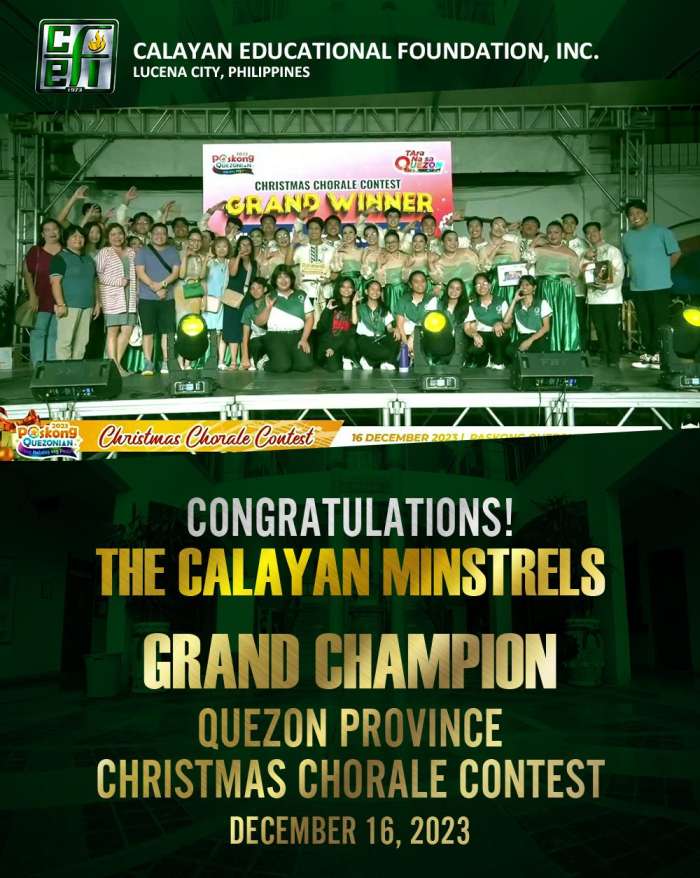 The CEFI community proudly congratulates our singing ambassadors, The Calayan Minstrels, who were declared the Grand Champion in the Quezon Province Christmas Chorale Contest held this evening at Quezon Provincial Capitol grounds.