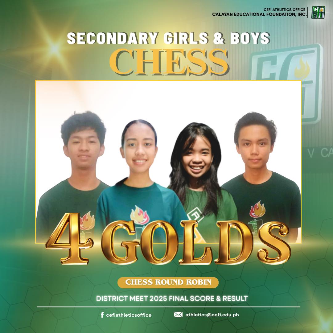 It’s raining gold at the District Meet 2025 as our Calayan Cougars Chess Team successfully claimed four golds in the round-robin competition. Composed of Laurelles, Cadacio, Regaza, and Doliente, the team made this victory truly glorious and now advances to the Lucena City Meet 2025.