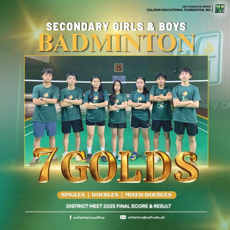 The CEFI Badminton Team poured in the gold at the District Meet 2025, bringing home a total of seven championship titles. Jarnero, Rojo, Oliveros, Chua, De Torres, Ramos, and Candelario completed a grand slam across all categories, securing their place at the Lucena City Meet 2025 next month.